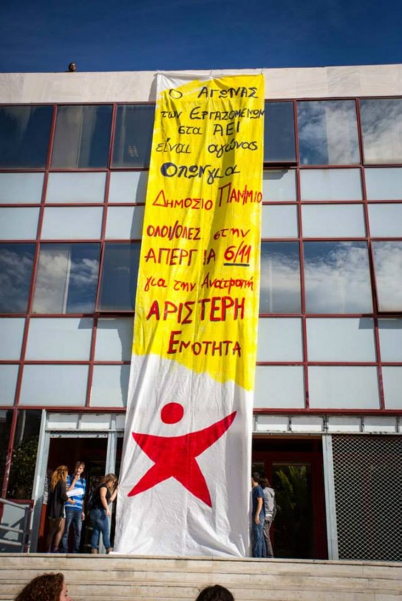 Η κίνηση των φοιτητών της Αριστερής Ενότητας έγινε ως ένδειξη συμπαράστασης στις κινητοποιήσεις των διοικητικών υπαλλήλων. Στην συνέχεια οι φοιτητές κρέμασαν ένα τεράστιο πανό ζητώντας τη συμμετοχή όλων στην αυριανή απεργία της ΓΣΕΕ και της ΑΔΕΔΥ.