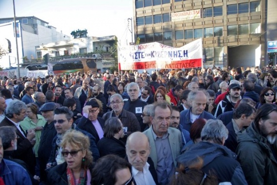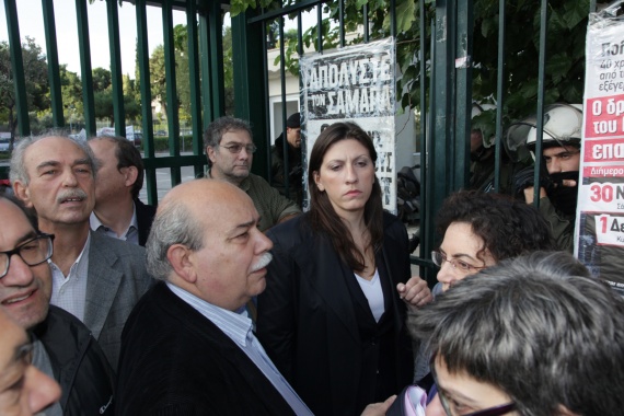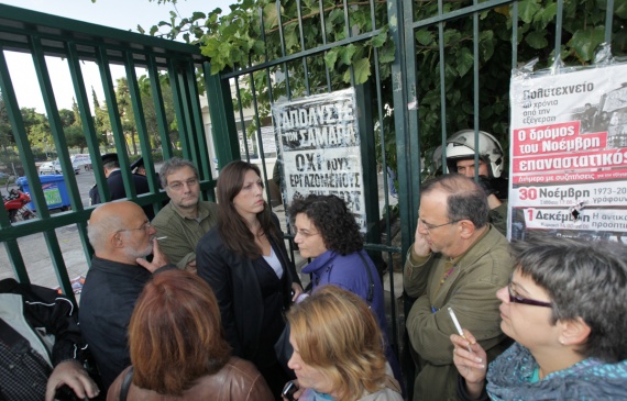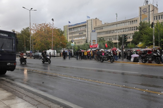 9:00 «Μετά το μαύρο της ΕΡΤ και τις μαζικές απολύσεις, η κρατική βία και τρομοκρατία δείχνει σήμερα το πρόσωπό της, δεν πρέπει να περάσει. Καλούμε το λαό να αντισταθεί και να φτιάξει ακόμα περισσότερες εστίες αντίστασης και αντεπίθεσης», δήλωσε το μέλος της Κ.Ε. του ΚΚΕ, Διαμάντω Μανωλάκου.