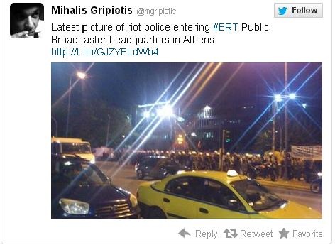 »Πριν από λίγη ώρα ισχυρές αστυνομικές δυνάμεις εισήλθαν στο Ραδιομέγαρο. Έχουν δώσει αυστηρό χρονοδιάγραμμα για την εκκένωση του κτηρίου, ειδάλλως θα συλλάβουν όσους παραμένουν εντός.