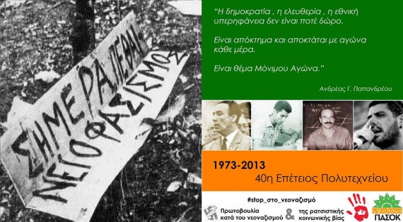 Αφίσα με τις φωτογραφίες του Παύλου Φύσσα, του Γρηγόρη Λαμπράκη, του Σωτήρη Πέτρουλα και του Νίκου Τεμπονέρα, τύπωσε η νεολαία του ΠΑΣΟΚ για τον εορτασμό της 17ης Νοεμβρίου.