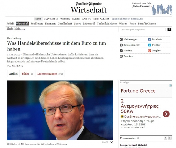 «Αυτή την εβδομάδα η Επιτροπή θα πρέπει να αποφασίσει εάν απαιτείται μια βαθύτερη ανάλυση για τη Γερμανία. Μια τέτοια εξέταση δεν θα έπρεπε να θεωρείται ταμπού. Αυτό δεν θα βοηθούσε ούτε τη Γερμανία, ούτε την Ευρώπη», γράφει ο επίτροπος αρμόδιος για την οικονομία και νομισματικά θέματα της ΕΕ Όλι Ρεν σε ένα άρθρο του που δημοσιεύθηκε στην Φρανκφούρτερ Αλγκεμάινε Τσάιτουνγκ.