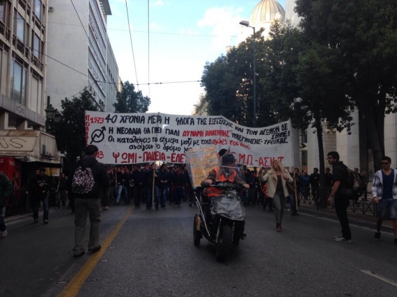 "Σήμερα, 40 χρόνια μετά την κορυφαία αντιδικτατορική εξέγερση του Νοέμβρη του 1973 στο Πολυτεχνείο, τα κύρια συνθήματα της εξεγερμένης νεολαίας και του λαού μας, τότε, για: «Ψωμί -Παιδεία -Ελευθερία», αποκτούν συγκεκριμένο περιεχόμενο στις συνθήκες που διαμορφώνονται από τη γενικευμένη οικονομική κρίση και τα αντιλαϊκά μέτρα που παίρνονται, δίνοντας σύγχρονα νοήματα στους σημερινούς αγώνες της νεολαίας και των εργαζομένων για ένα καλύτερο αύριο, για την αντιμετώπιση και ανατροπή της πολιτικής κάθε ξένου και ντόπιου κέντρου εξουσίας" αναφέρεται σε ανακοίνωση του Συνδέσμου Φυλακισθέντων και Εξορισθέντων Αντιστασιακών 1967-1974.