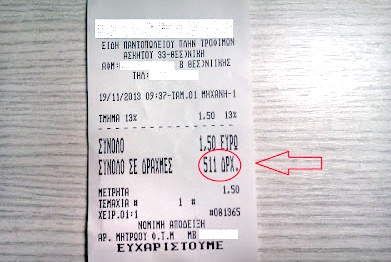 Η απόδειξη έχει ημερομηνία 1911/2013 και αν μη τι άλλο μας θυμίζει που θα ήταν οι τιμές σήμερα εάν ήταν σε δραχμές.