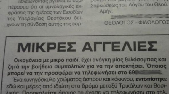 Μία ξυλόσομπα ζητά από τους συμπολίτες της οικογένεια στα Τρίκαλα, με αγγελία της σε τοπική εφημερίδα.