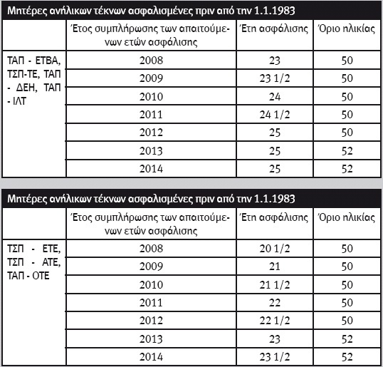 Την πόρτα της «εξόδου» βλέπουν το τρέχον έτος μητέρες ανήλικων τέκνων, ακόμη και στην ηλικία των 50 και 52 ετών. Πρόκειται για τις ασφαλισμένες των πρώην ειδικών ταμείων που ασφαλίστηκαν για πρώτη φορά στα ταμεία αυτά πριν από την 1.1.1983. Όπως βέβαια ισχύει και στα λοιπά ταμεία που αναγνωρίζουν τη δυνατότητα συνταξιοδότησης σε μητέρες ανηλίκου, έτσι και στα πρώην ειδικά ταμεία απαιτείται το έτος που συμπληρώνονται τα απαραίτητα έτη ασφάλισης να συντρέχει και η ανηλικότητα του τέκνου. Πράγματι, ο νομοθέτης έχει αφήσει ανεπηρέαστες αυτές τις κατηγορίες των ασφαλισμένων, καθότι τα συνταξιοδοτικά τους δικαιώματα ως επί το πλείστον κρίνονται ήδη κατοχυρωμένα και εξ αυτού του λόγου άξια προστασίας από τυχόν αλλαγές που θα επέλθουν στο νέο ασφαλιστικό. Αντιθέτως, τα όρια ηλικίας συνταξιοδότησης των ανδρών που ασφαλίστηκαν για πρώτη φορά στα πρώην ειδικά ταμεία πριν από την 1.1.1983 διαμορφώνονται διαφορετικά. Ειδικότερα, όσοι άνδρες συμπληρώνουν 25 έτη ασφάλισης μέχρι και την 31.12.2012, δύνανται να συνταξιοδοτηθούν σε ηλικία 60 ετών (μειωμένη σύνταξη) και σε ηλικία 65 ετών (πλήρης σύνταξη). Σημαντικό, ωστόσο, κρίνεται το γεγονός ότι οι διατάξεις των πρώην ειδικών ταμείων εξακολουθούν να ορίζουν τη δυνατότητα σε άνδρες/γυναίκες ασφαλισμένους προ της 1.1.1983 να συνταξιοδοτηθούν με τη συμπλήρωση 35ετίας, χωρίς τη συμπλήρωση συγκεκριμένου ορίου ηλικίας.