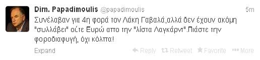 Στο θέμα αναφέρθηκε και ο βουλευτής του ΣΥΡΙΖΑ, Δημήτρης Παπαδημούλης, ο οποίος σε μήνυμά του στο twitter ανέφερε ότι «συνέλαβαν για 4η φορά τον Λάκη Γαβαλά, αλλά δεν έχουν ακόμη "συλλάβει" ούτε ευρώ από την "λίστα Λαγκάρντ".