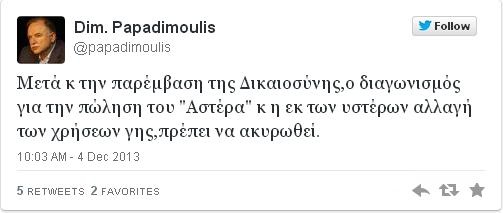Μέσω Twitter ο βουλευτής του ΣΥΡΙΖΑ Δημήτρης Παπαδημούλης ζητά την ακύρωση του διαγωνισμού για την πώληση του Αστέρα ύστερα από την εισαγγελική παρέμβαση για τη μελέτη οικοδόμησης στην περιοχή.