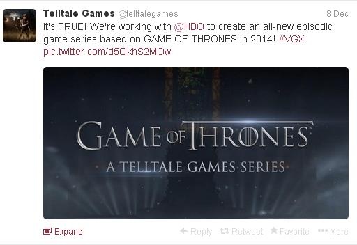 Συγκεκριμένα, η εταιρεία Telltale Games, που βρίσκεται πίσω από τη δημιουργία των παιχνιδιών, Jurassic Park και The Walking Dead, επιβεβαίωσε στον λογαριασμό της στο Twitter ότι ετοιμάζεται να βγάλει το Game of Thrones σε video game.