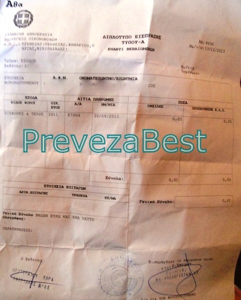 Όπως ανέφερε ο πολίτης στο prevezabest, μη μπορώντας να συγκρατήσει τα γέλια του, έδωσε το οφειλόμενο ποσό (ένα κέρμα του ενός λεπτού) στην εφορία και έτσι έλαβε την φορολογική ενημερότητα που ζητούσε.