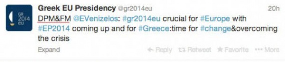 Στα tweet που ανέβηκαν στον επίσημο λογαριασμό ο Ευάγγελος Βενιζέλος αναβαθμίστηκε από αντιπρόεδρος της κυβέρνησης (Vice President) σε αναπληρωτή πρωθυπουργό (Deputy Prime Minister).