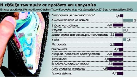Ίδια είναι η εικόνα που καταγράφουν τα στοιχεία της ΕΛΣΤΑΤ για ολόκληρο το έτος. Ειδικότερα, ο γενικός δείκτης τιμών καταναλωτή τον μήνα Δεκέμβριο του 2013 (σε σχέση με τον Δεκέμβριο του 2012) παρουσίασε μείωση κατά 1,7%, με τα τρόφιμα να εμφανίζουν κατά μέσο όρο τη μικρότερη μείωση, μόνο κατά 0,8%, όταν σε αρκετές υπηρεσίες η πτώση των τιμών έφτασε και ξεπέρασε το 4%.