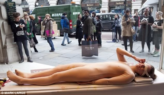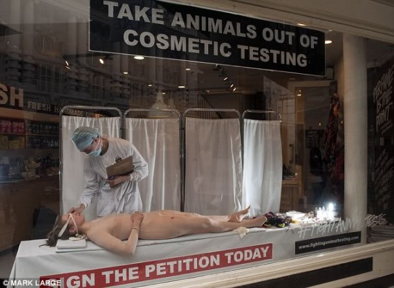 Η καμπάνια έγινε στη βιτρίνα του καταστήματος στην Regent Street του Λονδίνου και η Jacqueline Traide πέρασε από δοκιμές 10 ωρών δείχνοντας τι περνούν τα ζώα για τη βιομηχανία καλλυντικών.