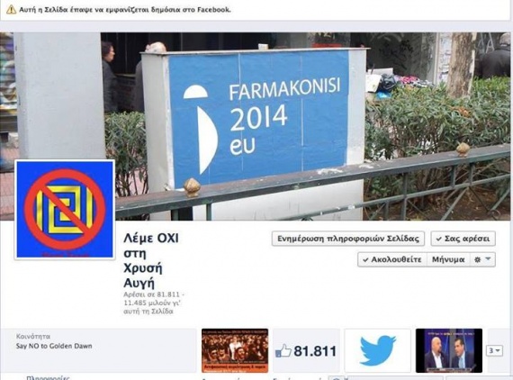Στη διαγραφή της σελίδας «ΛΕΜΕ ΟΧΙ ΣΤΗ ΧΡΥΣΗ ΑΥΓΗ» προχώρησε τη Δευτέρα το facebook.