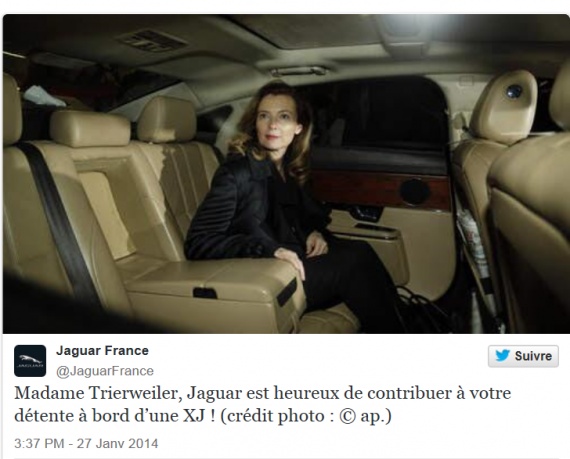 Η Jaguar Γαλλίας έσπευσε να εκμεταλλευθεί την ευκαιρία και ανήρτησε στο twitter μία φωτογραφία την οποία συνόδευσε με το ακόλουθο μήνυμα: «Κα Τριερβελέρ, η Jaguar είναι χαρούμενη που βοήθησε στη χαλάρωσή σας μέσα στην XJ»…