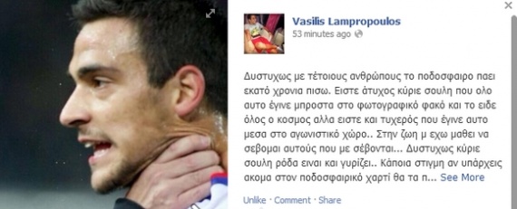 Ο Βασίλης Λαμπρόπουλος λίγο μετά το τέλος της αναμέτρησης ανέβασε στο Facebook μία φωτογραφία που δείχνει τον Σούλη Παπαδόπουλο να τον έχει πιάσει από τον λαιμό, ενώ έκανε κι ένα σχόλιο.