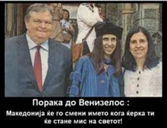 Υπενθυμίζεται ότι ο κ. Αντόνοφσκι, προχθές, ανήρτησε στη σελίδα κοινωνικής δικτύωσης, ενόψει της επίσκεψης του κ. Βενιζέλου στα Σκόπια, το εξής σχόλιο: «Μήνυμα για τον Βενιζέλο: Η Μακεδονία θα αλλάξει το όνομα της, όταν η κόρη σου γίνει Μις Κόσμος!». Το σχόλιο συνοδεύεται με φωτογραφία της οικογένειας του κ. Βενιζέλου.