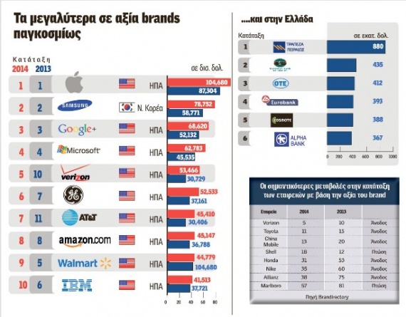 Όσον αφορά την αξία των εμπορικών σημάτων επιχειρήσεων από την Ελλάδα, η Brandirectory αξιολόγησε 14 brands. Στην κατάταξη η κυριαρχία των τραπεζών και των τηλεπικοινωνιακών παρόχων είναι σχεδόν απόλυτη.