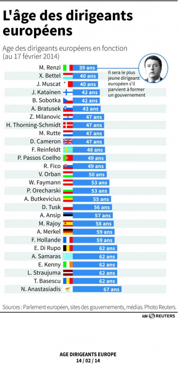 Ο μέσος όρος της ηλικίας τους είναι περίπου τα 50 χρόνια. Την πρώτη θέση κατέχει ο νέος πρωθυπουργός της Ιταλίας, Ματέο Ρέντσι, που είναι μόλις 39 ετών.