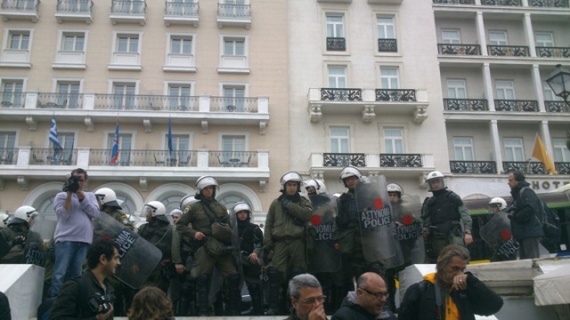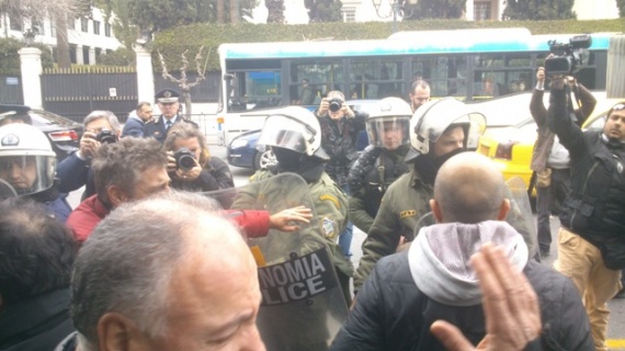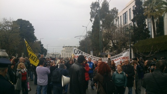 Νωρίτερα, είχαν πραγματοποιήσει συγκέντρωση έξω από το υπουργείο Οικονομικών, όπου έγινε η συνάντηση μεταξύ του υπουργού Διοικητικής Μεταρρύθμισης Κυριάκου Μητσοτάκη και των μελών της τρόικας.