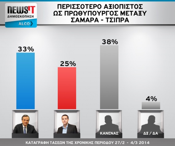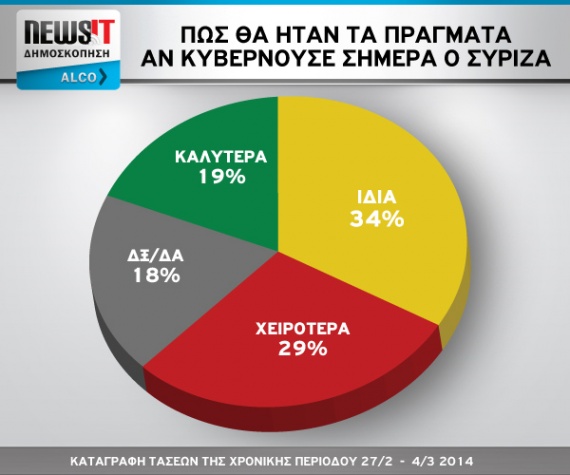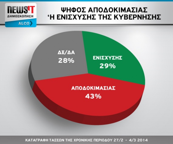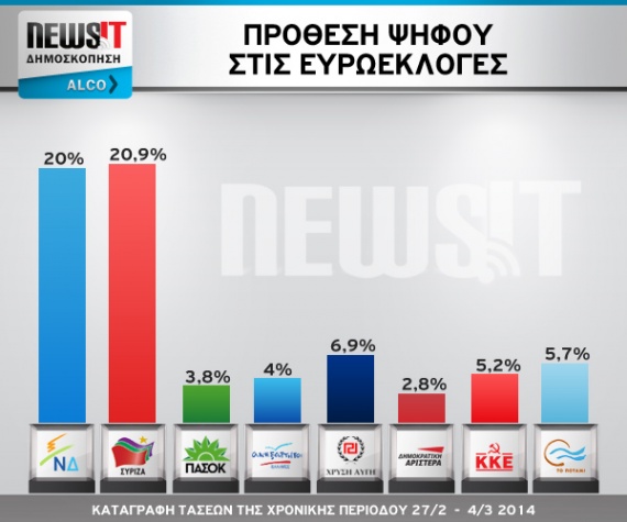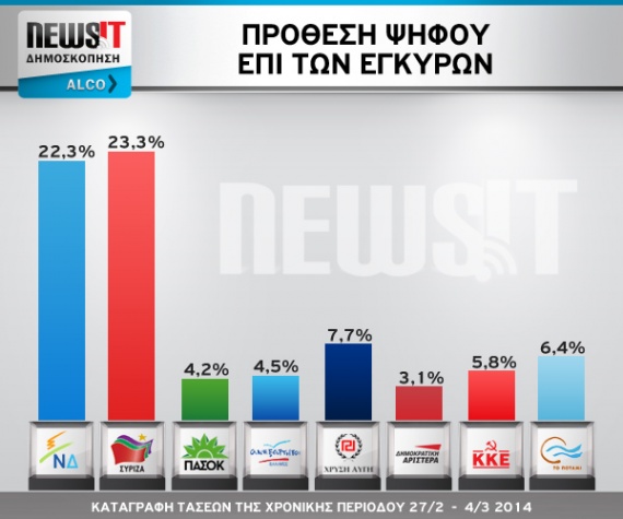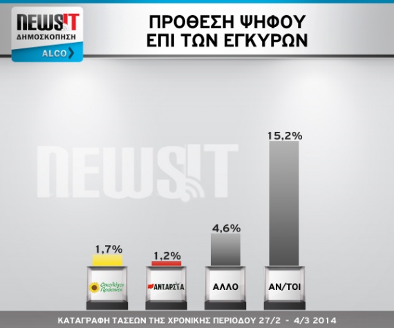 Η δημοσκόπηση διενεργήθηκε από την εταιρεία Alco για λογαριασμό του NewsIt με δείγμα 1.000 ατόμων από όλη τη χώρα και τα αποτελέσματα έχουν ως εξής: