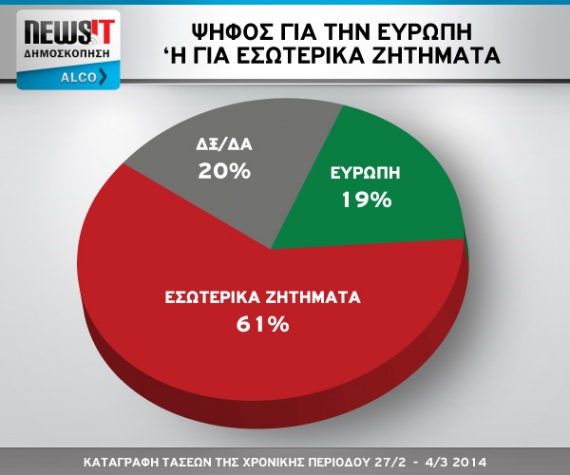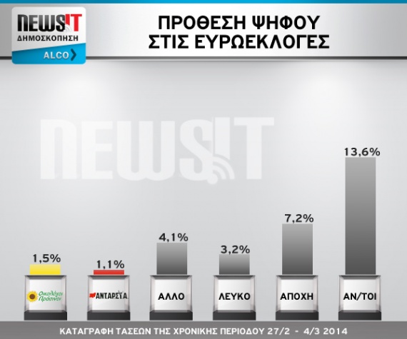 Από την εκλογική διαδικασία των ευρωεκλογών δηλώνει πως θα απέχει το 7,2%, ενώ οι αναποφάσιστοι φτάνουν στο 13,6%.