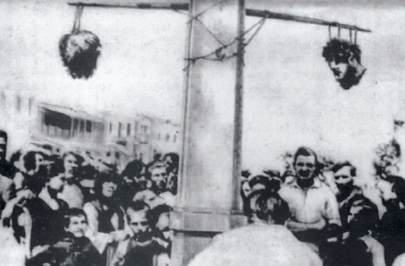 Έμειναν κρεμασμένα δύο μέρες. Ήταν πιασμένα με σκοινί από τις άκρες ενός πασάλου, που δέθηκε πάνω στον πανύψηλο φανοστάτη με τρόπο που να είναι εύκολο να το διακρίνει κανείς ακόμα και μέσα από το πυκνό πλήθος.