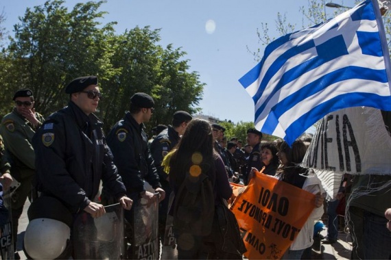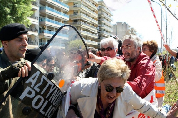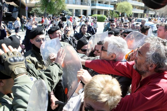 Οι διαδηλωτές έφτασαν μέχρι το μπλόκο της αστυνομίας, σε απόσταση περίπου διακοσίων μέτρων από την εξέδρα των επισήμων, προσπάθησαν να πλησιάσουν, αλλά τα ΜΑΤ τους απώθησαν βίαια με αποτέλεσμα να παραμείνουν στο ίδιο σημείο μέχρι το τέλος της παρέλασης, φωνάζοντας συνθήματα.