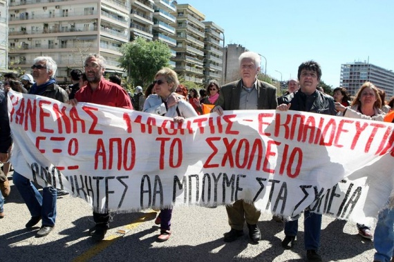 Συγκέντρωση στον Λευκό Πύργο και πορεία με κατεύθυνση το σημείο, όπου πραγματοποιήθηκε η παρέλαση για την 25η Μαρτίου έκαναν εκπαιδευτικοί και σχολικοί φύλακες, σε ένδειξη διαμαρτυρίας τις απολύσεις.