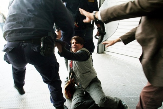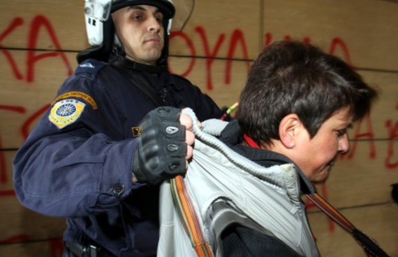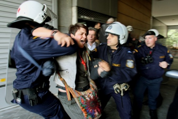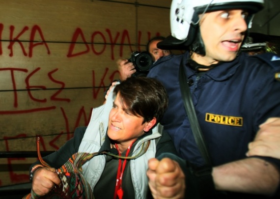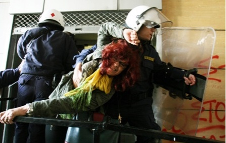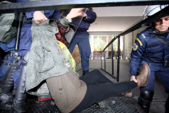 Τα ΜΑΤ τις απώθησαν σέρνοντας τες στα σκαλιά και τραβώντας τες μακριά από την είσοδο του κτηρίου.