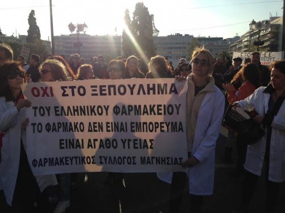 Στο συλλαλητήριο συγκεντρώθηκαν περισσότεροι από 2.000 φαρμακοποιοί που κρατούσαν μαύρες σημαίες και πλακάτ με συνθήματα.