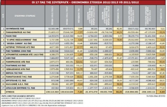 Οι συνολικές ζημίες προ φόρων που κατέγραψαν οι 17 ΠΑΕ για το 2012/2013 φτάνουν στα 21,48 εκατ. ευρώ, μειωμένες κατά 56,20% σε σχέση με τις ζημίες προ φόρων του 2011/2012 (αυτό οφείλεται στο ότι η Παναθηναϊκός Α.Ο. ΠΑΕ κατάφερε να περιορίσει κατά 44,24% το 2012/2013 τις ζημίες προ φόρων της – το 2012/2013 ανήλθαν στις 14,92 εκατ. ευρώ, όταν το 2011/2012 ήταν στις 26,75 εκατ. ευρώ, η «Ο Άρης Θεσσαλονίκης» ΠΑΕ κατάφερε να περιορίσει κατά 79,80% τις ζημίες προ φόρων της – το 2012/2013 ανήλθαν στις 1,22 εκατ. ευρώ, όταν το 2011/2012 ήταν 6,03 εκατ. ευρώ, και η ΠΑΣ Γιάννινα 1966 ΠΑΕ κατάφερε τις ζημίες προ φόρων του 2011/2012, ύψους 1,69 εκατ. ευρώ, να τις μετατρέψει το 2012/2013 σε κέρδη προ φόρων 1,04 εκατ. ευρώ).
