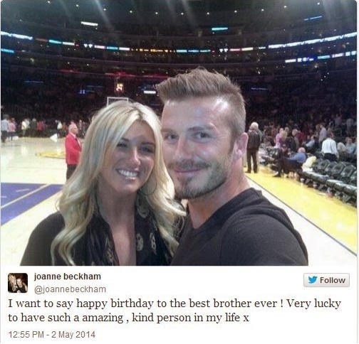 Η Τζόαν Μπέκαμ, που είναι μικρότερη από τον Ντέιβιντ και αντιμετωπίζει συχνά πρόβλημα με το βάρος της, αποφάσισε να ευχηθεί μέσω Twitter χρόνια πολλά στον αδερφό της, o οποίος έκλεισε τα 39 του χρόνια.