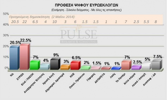 Νέα άνοδο του ΣΥΡΙΖΑ και διεύρυνση της διαφοράς του από τη Ν.Δ. κατά 0,5% καταδεικνύει το δεύτερο κύμα αποτελεσμάτων της κυλιόμενης δημοσκόπησης της Pulse RC για topontiki.gr.