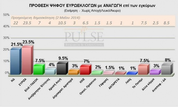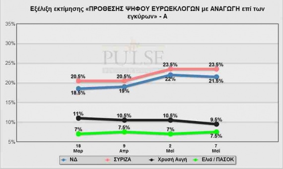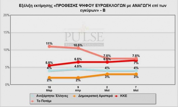 Η διακύμανση της διαφοράς του ΣΥΡΙΖΑ από τη Ν.Δ. στην Εξέλιξη της Πρόθεσης Ψήφου με αναγωγή επί των εγκύρων ανεβαίνει πάλι στο 2%, όπως στις 18 Μαρτίου. Κατά τα λοιπά (πάντα σε σύγκριση με τις 18 Μαρτίου και μετέπειτα) η Χρυσή Αυγή συνεχίζει την αργή αλλά σταθερή κάθοδό της, η Ελιά παραμένει στη διακύμανση της μισής μονάδας, το Ποτάμι δεν άλλαξε την καθοδική ροή του, το ΚΚΕ αντιθέτως συνεχίζει να ανεβαίνει, οι ΑΝ.ΕΛΛ. παραμένουν σταθεροί και η ΔΗΜΑΡ διατηρεί το μικρό της κέρδος.