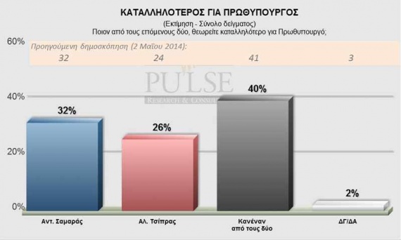 Μείωση της διαφοράς του κατά 2% από τον Αντώνη Σαμαρά καταγράφει ο Αλέξης Τσίπρας στο ερώτημα για τον Καταλληλότερο για Πρωθυπουργό. Για την ακρίβεια, συγκριτικά με το πρώτο κύμα αποτελεσμάτων της κυλιόμενης δημοσκόπησης της Pulse, ο Τσίπρας κερδίζει 2 μονάδες, ο Σαμαράς παραμένει σταθερός και ο Κανένας χάνει 1 μονάδα, όπως και η απάντηση Δεν Ξέρω / Δεν απαντώ.