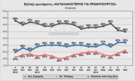 Η μόνη αξιοσημείωτη παρατήρηση στην Εξέλιξη του ερωτήματος Καταλληλότερος για Πρωθυπουργός είναι ότι ο Αλέξης Τσίπρας, ο οποίος στο παρελθόν εμφάνιζε σημαντικές μεταπτώσεις, από τις 9 Απριλίου και ύστερα προσθέτει 2% σε κάθε νέα έρευνα, ενώ ο Αντώνης Σαμαράς, πιο σταθερός εδώ και ενάμιση χρόνο, φαίνεται να έχει βρει οροφή.