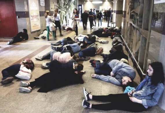 Άλλη ομάδα νέων ξάπλωσε στο έδαφος στο Μετρό στην πλατεία Ταξίμ, παριστάνοντας τους νεκρούς.