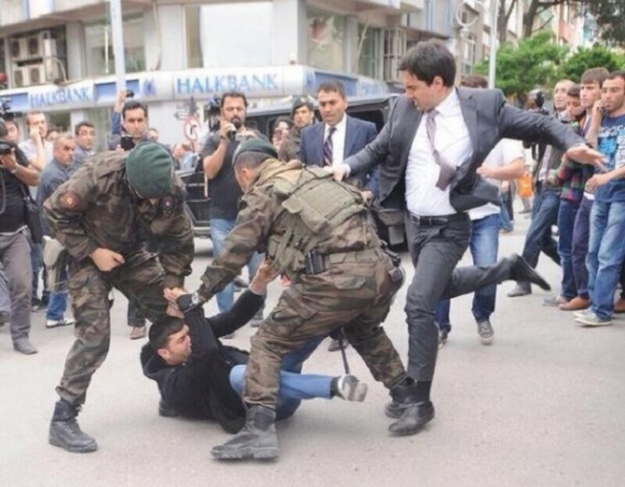 Η δεύτερη φωτογραφία που κάνει τον γύρο του διαδικτύου δείχνει στη Σόμα έναν σύμβουλο του Ερντογάν, τον Γιουσούφ Γερκέλ, να κλωτσάει με απίστευτη αγριότητα διαδηλωτή που τον κρατάνε ακινητοποιημένο στο έδαφος δυο στρατιώτες. Σύμφωνα με την «Hurriyet», ο Γερκέλ επιχείρησε να δικαιολογηθεί λέγοντας: «Προσέβαλε εμένα και τον πρωθυπουργό, τι έπρεπε να κάνω;».