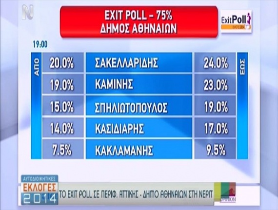 Στον δήμο της Αθήνας προηγείται ο υποψήφιος του ΣΥΡΙΖΑ Γαβριήλ Σακελαρίδης με 22,4% και ακολουθούν ο Γιώργος Καμίνης με 20,6%, ο υποψήφιος της Χρυσής Αυγής Ηλ. Κασιδιάρης με 15,9% και ο Άρης Σπηλιωτόπουλος με 15,7%.