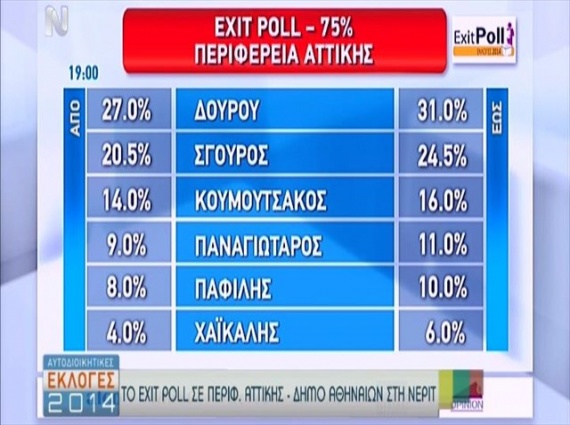 Προβάδισμα της Ρένας Δούρου και του Γαβριήλ Σακελλαρίδη για την περιφέρεια Αττικής και τον δήμο Αθηναίων αντίστοιχα, δείχνει η δημοσκόπηση εξόδου που μετέδωσαν οι τηλεοπτικοί σταθμοί στις 19:00, την ώρα που έκλεισαν οι κάλπες.