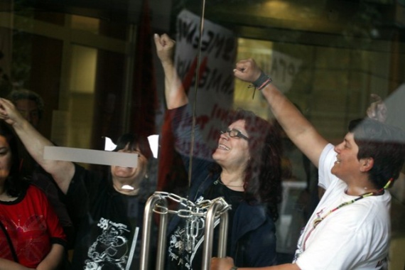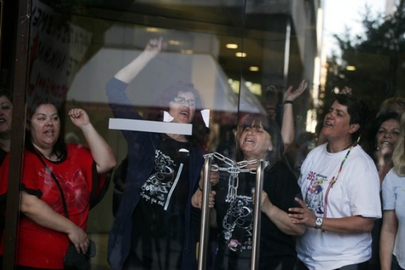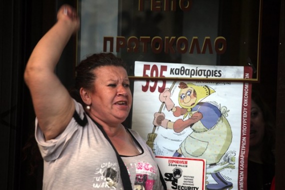 Η αστυνομία έχει ζητήσει από τις καθαρίστριες να απομακρυνθούν από την είσοδο του υπουργείου, την οποία έχουν κλείσει με αλυσίδες.