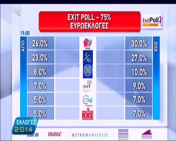 Προβάδισμα του ΣΥΡΙΖΑ δείχνουν τα exit polls (στο 75%) για τις ευρωεκλογές, με τη ΝΔ να ακολουθεί και τη Χρυσή Αυγή να έρχεται στην τρίτη θέση. Ενισχυμένη εμφανίζεται η Ελιά.
