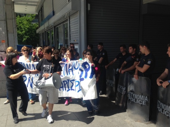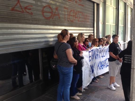 Σε συμβολικό αποκλεισμό της εισόδου του υπουργείου Οικονομικών, επί της οδού Νίκης, προχώρησαν οι απολυμένες καθαρίστριες του υπουργείου Οικονομικών.