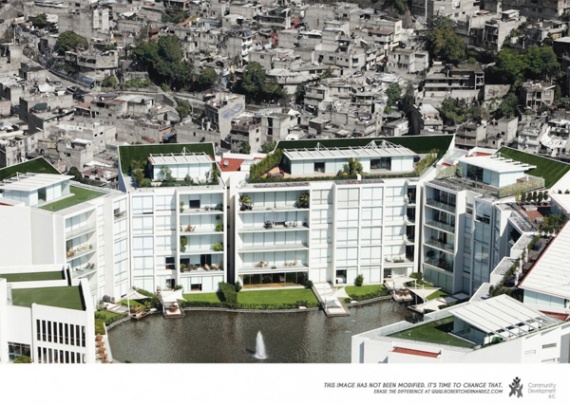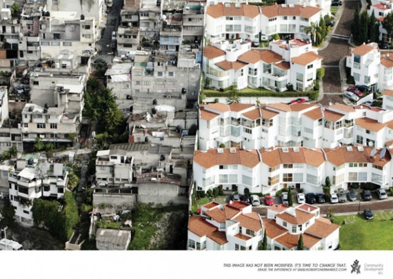 Οι αεροφωτογραφίες δεν έχουν υποστεί επεξεργασία και δείχνουν από τη μία μεγάλες μεζονέτες και πάρκινγκ και καταπράσινους κήπους και στην πίσω πλευρά τους να ξεκινάνε τα χαμόσπιτα, γκρίζα και ταπεινά να εκτείνονται παράλληλα με τις βίλες.
