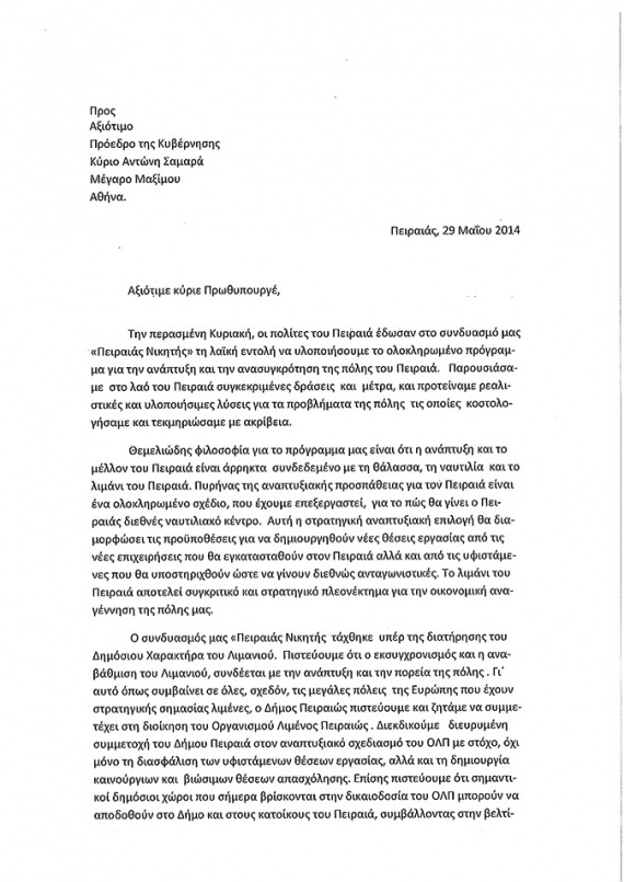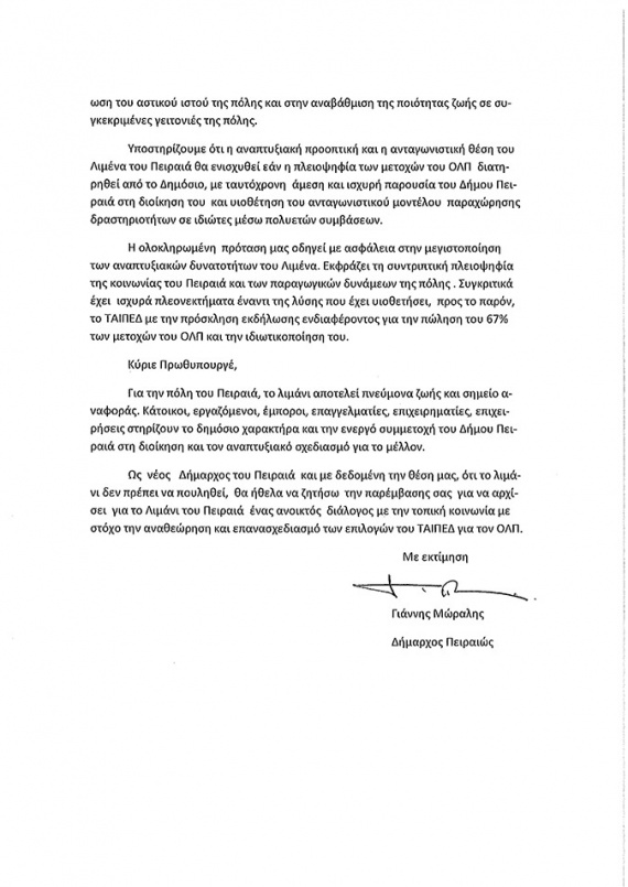Ολοκληρώνοντας την επιστολή του καλεί τον πρωθυπουργό να παρέμβει για να ξεκινήσει για το λιμάνι του Πειραιά ανοικτός διάλογος με την τοπική κοινωνία «με στόχο την αναθεώρηση και επανασχεδιασμό των επιλογών του ΤΑΙΠΕΔ για τον ΟΛΠ».