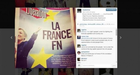 H διάσημη τραγουδίστρια της ποπ ανήρτησε τη Δευτέρα στο Instagram μια φωτογραφία του πρωτοσέλιδου της εφημερίδας Libération με ημερομηνία 26 Μαΐου και τίτλο «Η Γαλλία FN», και σχολίασε: «Ρωσία, Ουκρανία, Βενεζουέλα, και τώρα η Γαλλία;!!!» και προσθέτοντας τις ετικέτες «#καταπολεμήστε τον φασισμό», «#καταπολεμήστε τις διακρίσεις» .
