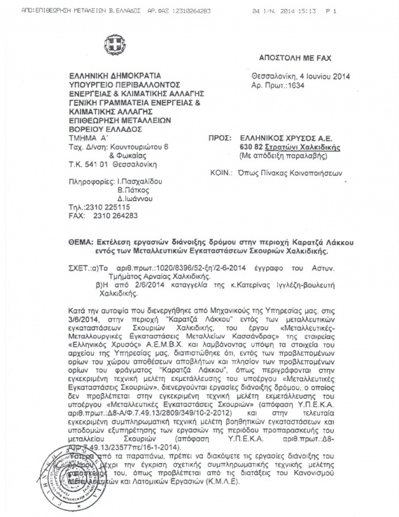 Στο έγγραφο της Επιθεώρησης Μεταλλείων με ημερομηνία 4 Ιουνίου 2014 επισημαίνεται ότι μετά από αυτοψία διαπιστώθηκε ότι διενεργούνται εργασίες για τη διάνοιξη δρόμου ο οποίος δεν προβλέπεται στην εγκεκριμένη τενχική μελέτη!