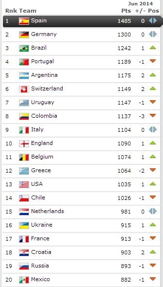 Πρώτη στη λίστα παραμένει η Ισπανία και την ακολουθούν Γερμανία στη δεύτερη θέση και Βραζιλία στην τρίτη, η οποία προσπέρασε την Πορτογαλία.