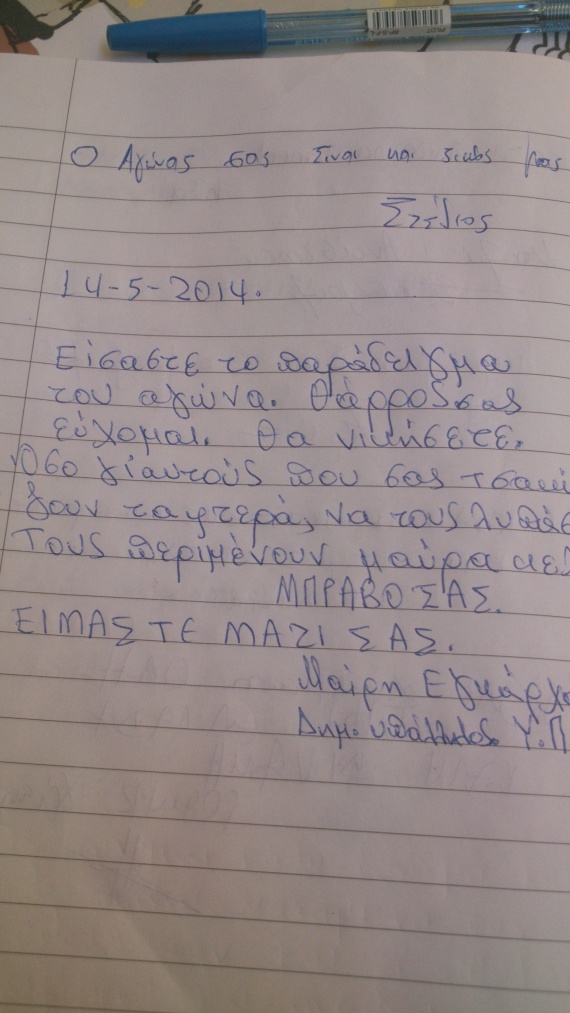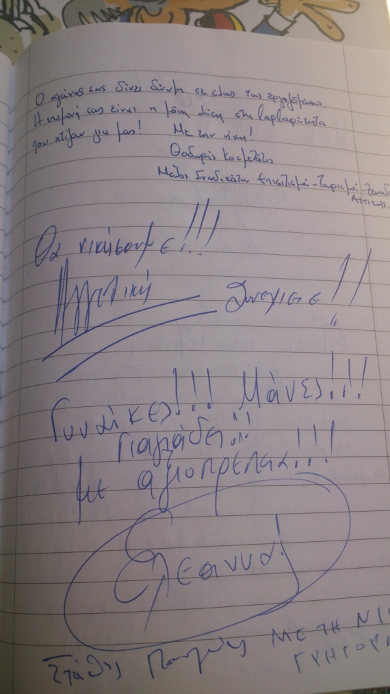 Οι χιλιάδες πολίτες που καθημερινά περνούν από την Καραγεώργη Σερβίας για να δηλώσουν το σεβασμό τους στις αγωνιζόμενες καθαρίστριες είναι η καλύτερη απάντηση στις δυνάμεις των ΜΑΤ που τις χρησιμοποιούν σαν σάκο του μποξ. Στο βιβλίο συμπαράστασης που οι καθαρίστριες έχουν ανοίξει τα συγκινητικά λόγια των πολιτών είναι η «ασπίδα» στις σιδηρογροθιές. Το www.topontiki.gr, ξεφύλλισε το βιβλίο και κατέγραψε τα από καρδιάς μηνύματα συμπαράστασης.