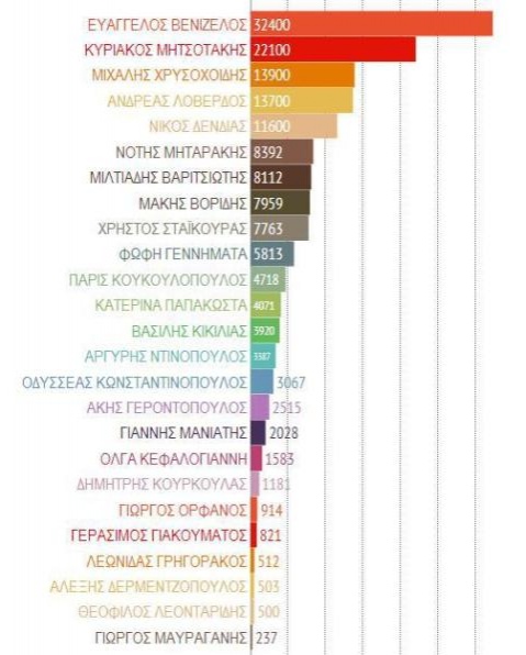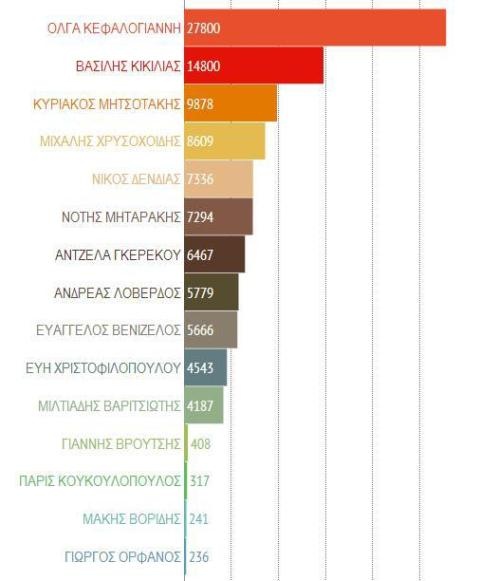 Πρώτος στη λίστα με τους περισσότερους followers στο Twitter είναι ο Ευάγγελος Βενιζέλοςπου διαθέτει έναν λογαριασμό με 32.400 followers και στη δεύτερη θέση ο Κυριάκος Μητσοτάκης με 22.100 followers. Στην τρίτη θέση της κατάταξης είναι ο Μιχάλης Χρυσοχοίδης με 13.900 followers και πολύ κοντά στην τέταρτη θέση ο Ανδρέας Λοβέρδος με 13.700. Την πρώτη πεντάδα συμπληρώνει ο Νίκος Δένδιας με 11.600 followers. Στην έκτη θέση ο Νότης Μηταράκης, στην έβδομη ο Μιλτιάδης Βαρβιτσιώτης και στην όγδοη ο Μάκης Βορίδης. Στην ένατη θέση βρίσκεται ο Χρήστος Σταϊκούρας ενώ τη δεκάδα συμπληρώνει δέκατη η Φώφη Γεννηματά.